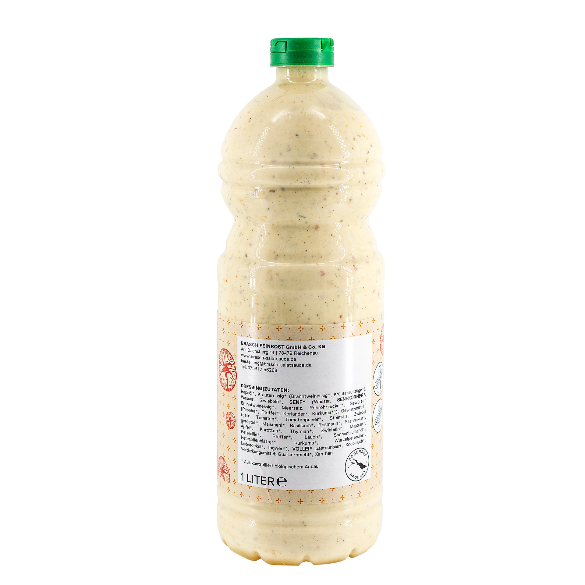 Zutaten: Rapsöl*, Kräuteressig* (Branntweinessig*, Kräuterauszüge*), Wasser, Zwiebeln*, SENF* (Wasser, SENFKÖRNER*,Branntweinessig*, Meersalz, Rohrohrzucker*, Gewürze* [Paprika*, Pfeffer*, Koriander*, Kurcuma*]), Gewürzmittel* (getr. Tomaten*, Tomatenpulver*, Steinsalz, Zwiebel geröstet*, Maismehl*, Basilikum*, Rosmarin*, Pastinaken*, Äpfel*, Karotten*, Thymian*, Zwiebeln*, Majoran*, Petersilie*, Pfeffer*, Lauch*, Sonnenblumenöl*, Petersilienblätter*, Kurkuma*, Wurzelpetersilie*. Liebstöckel*, Ingwer*), VOLLEI* pasteurisiert, Knoblauch*, Verdickungsmittel: Guarkernmehl*, Xanthan